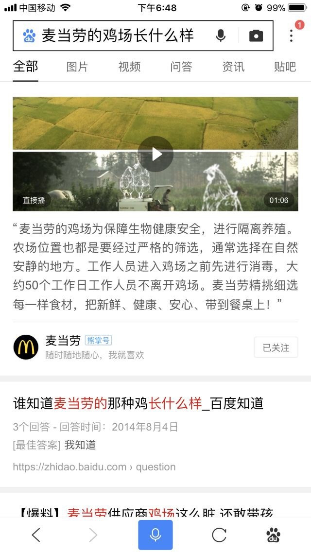 百度熊掌号“企业qw问答”则能让企业官方信息内容展示在搜索页排名首位。比如当用户在百度app上搜索“麦当劳的鸡场长什么样”就可以看到麦当劳官方展示的信息,qw的内容和展现形式都会更加吸引用户关注。